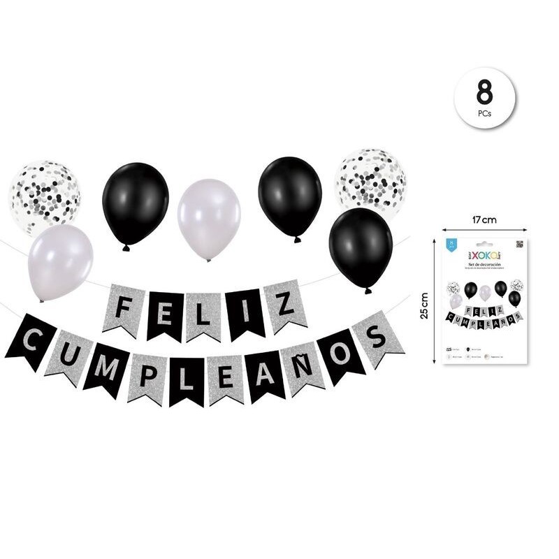 Guirnalda Feliz cumpleanos plata negro con 8 globos 8433584934720 93472